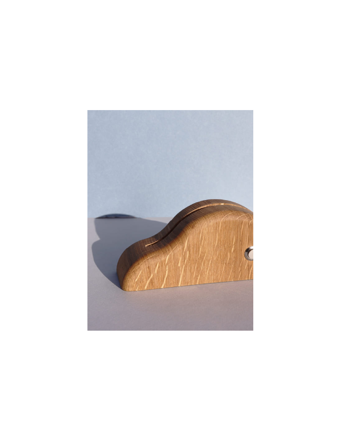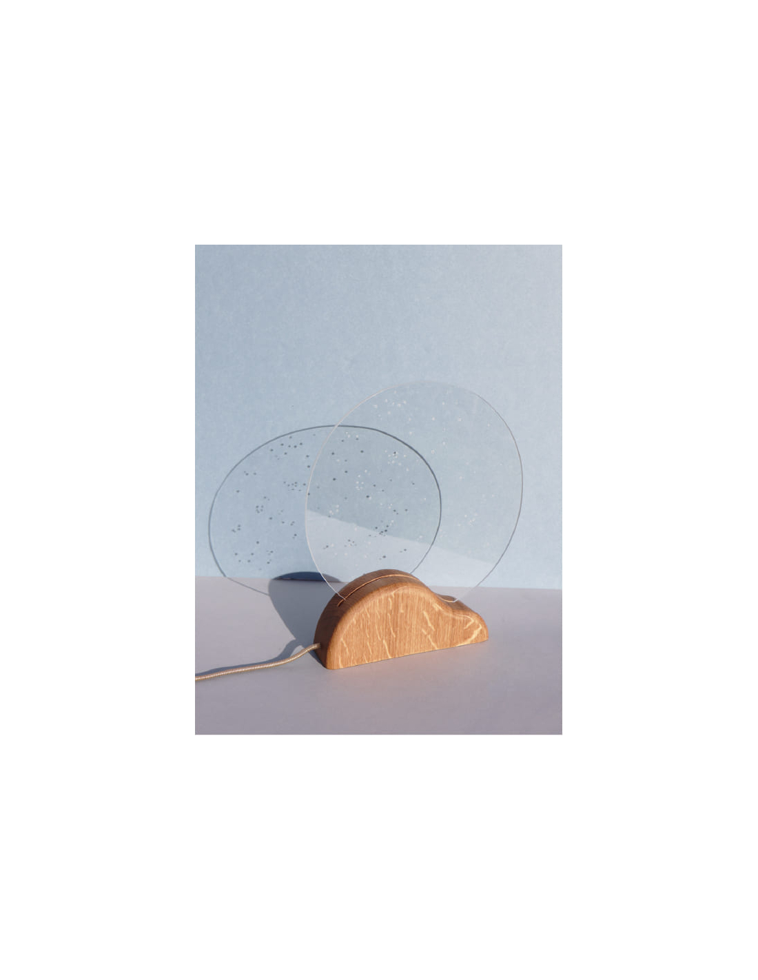 Cette lampe au design minimaliste est composée d'un socle en chêne massif local et d'une plaque en plexiglas interchangeable.