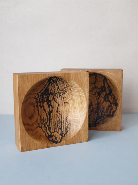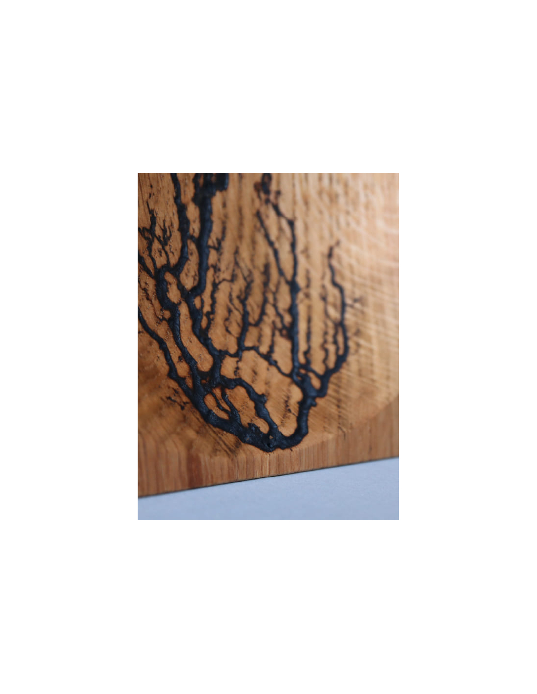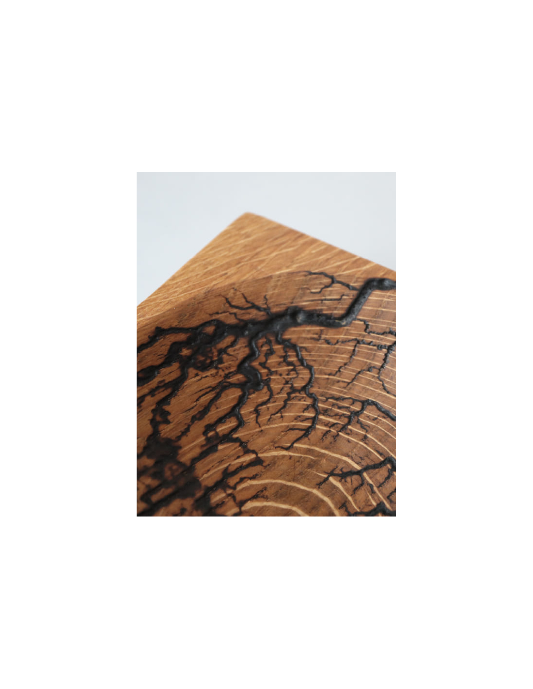 Chaque pièce est sculptée dans du chêne local, puis gravée à l’aide d’un courant électrique, reproduisant les formes aléatoires et spectaculaires d’un éclair. Son design intemporel s’intègre parfaitement dans tout type d’intérieur, qu’il soit moderne ou rustique.